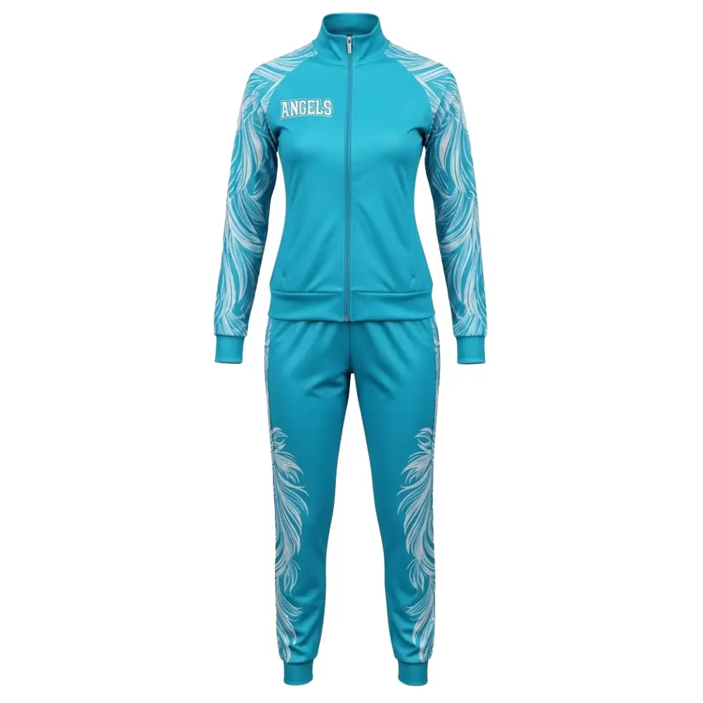 The Aqua Blue Angels Feather Wings Tracksuit is designed for teams that move with elegance and confidence. Featuring feather-inspired graphics and a radiant wing motif, this set blends visual grace with performance-ready comfort.