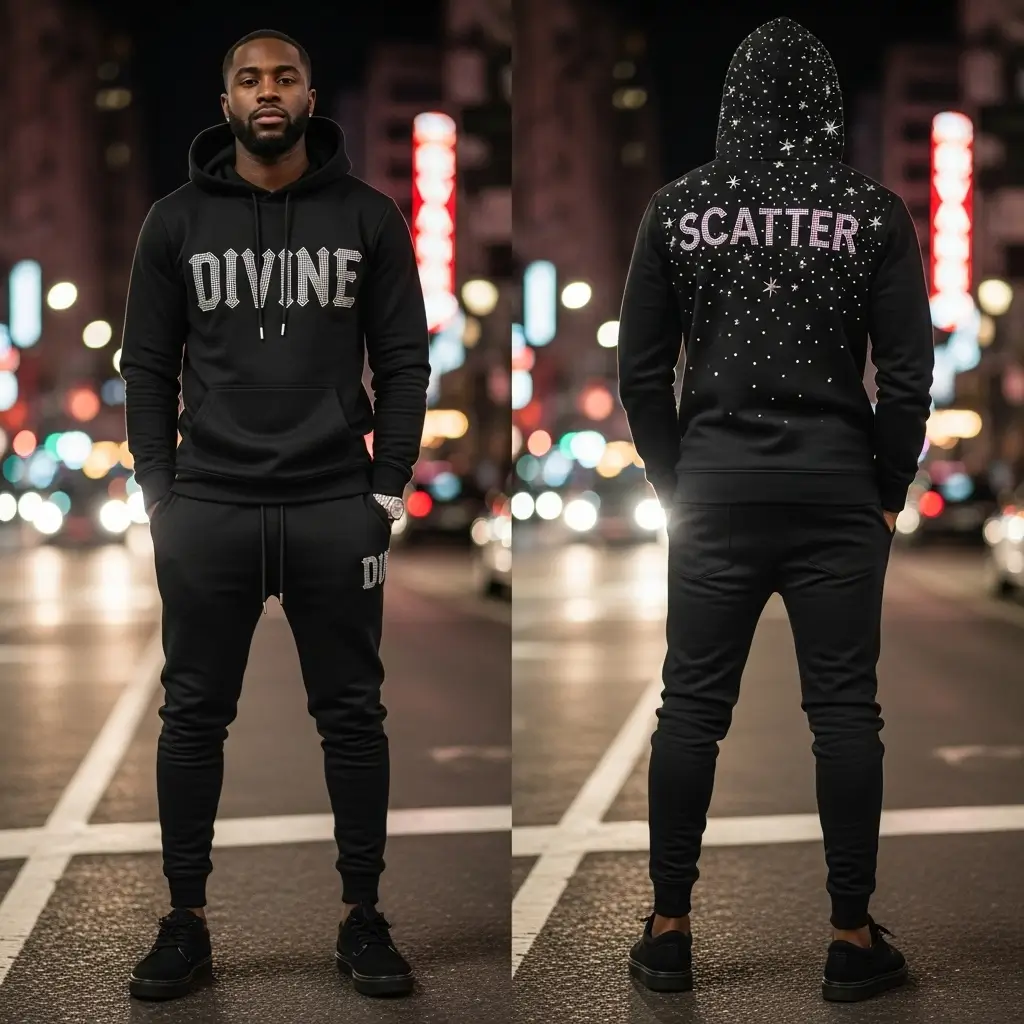 Turn heads with the Black Rhinestone Divine Scatter Sweatsuit—crafted for bold brands, fashion-forward teams, and standout streetwear drops.