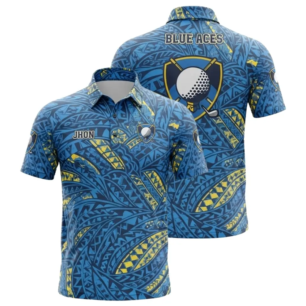 The Blue Tribal Golf Shirt is built for teams that want to stand out on the course. Featuring a bold tribal pattern and shield-style golf crest, this shirt combines visual impact with high-performance features.