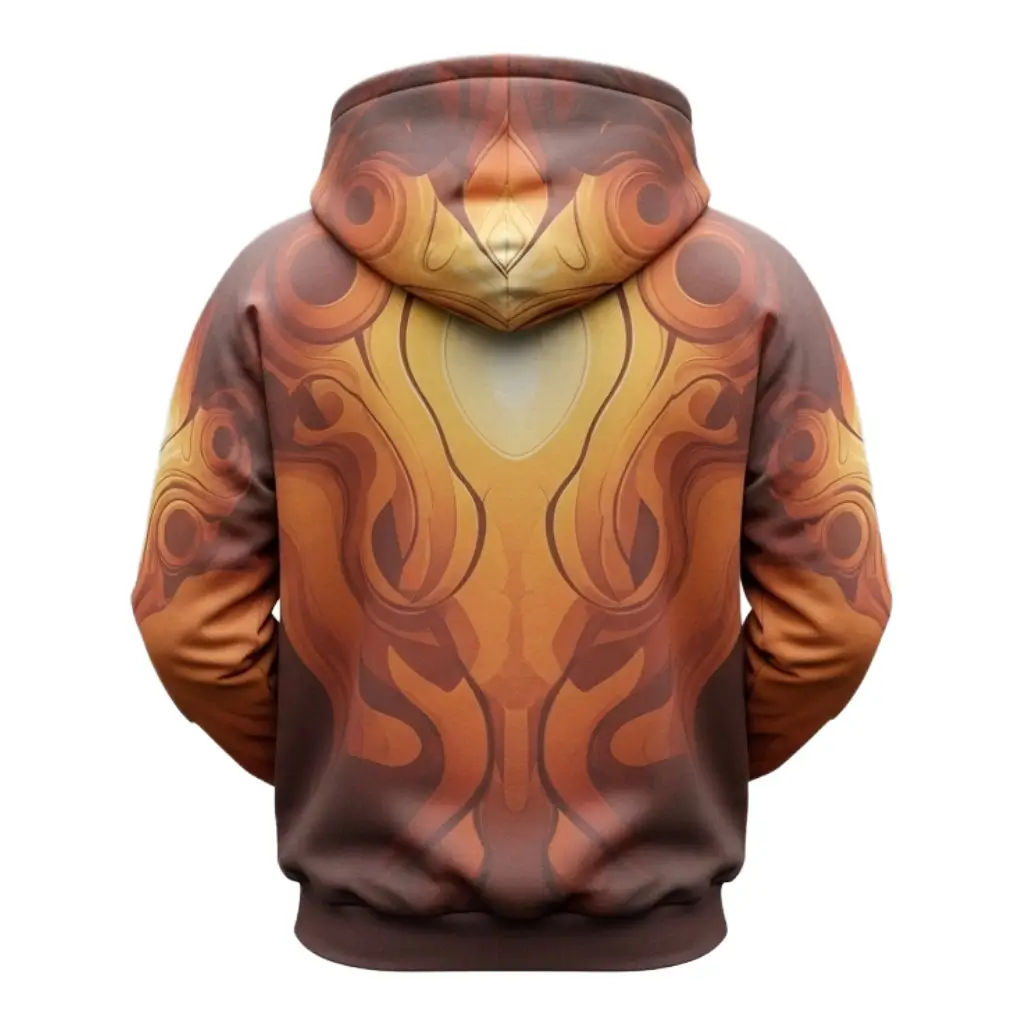 Set your brand ablaze with this 100% customizable sublimation hoodie, featuring symmetrical flame-like graphics in rich tones of brown, orange, and yellow.