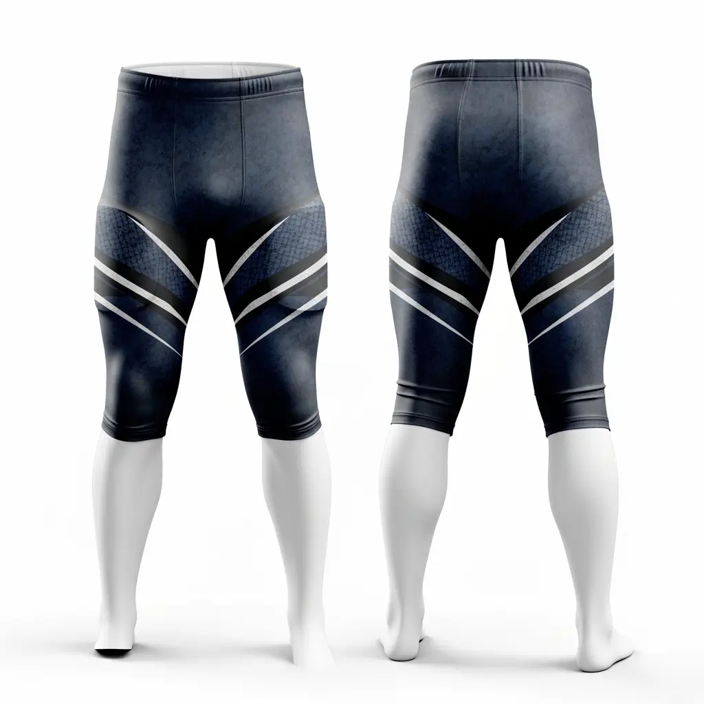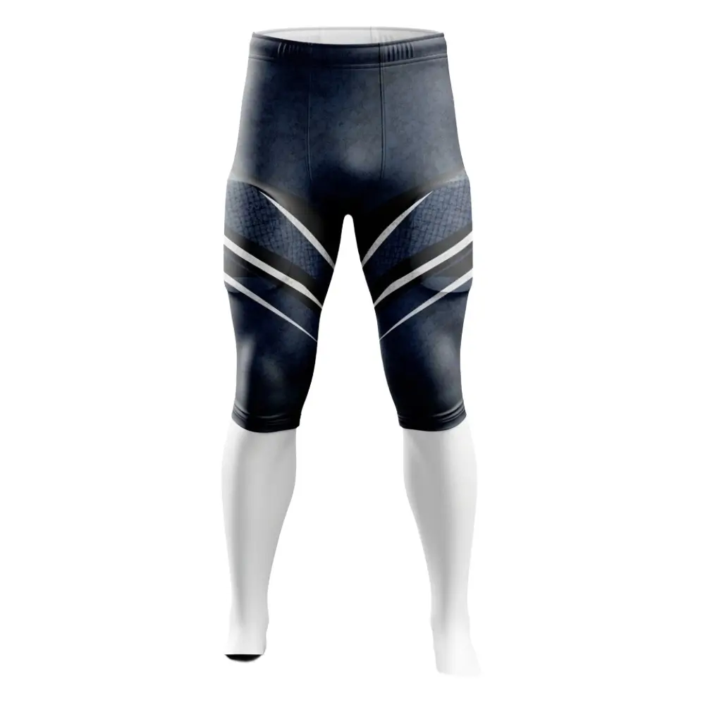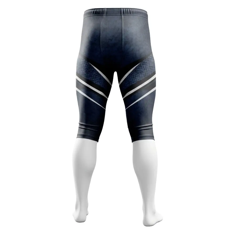- Color Scheme: Dark blue and black base with white and gray chevron stripes wrapping around thighs and calves for a sculpted look.