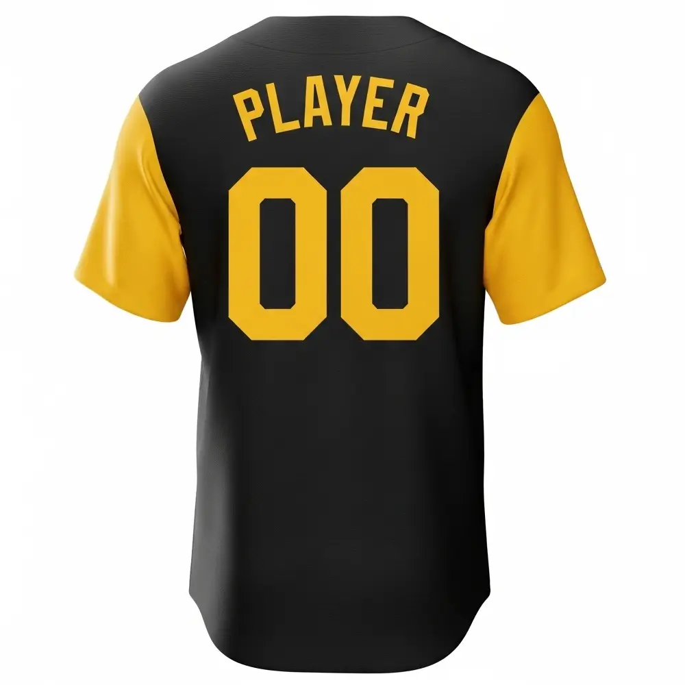 Our custom baseball uniform package in black and yellow is made for teams that want to stand out with a bold look. This Ghosts-themed set comes with a default 2-button jersey featuring a solid black base, yellow short sleeves, yellow buttons, and yellow lettering—sharp, clean, and powerful.