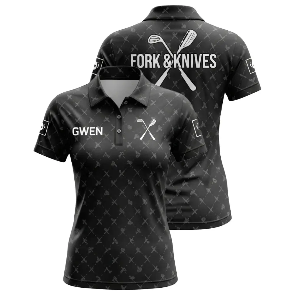 The Fork and Knives Women’s Golf Shirt is designed for teams that blend hospitality with high-performance style. Featuring a sleek black base and utensil-themed graphics, this shirt delivers bold branding and everyday comfort.
