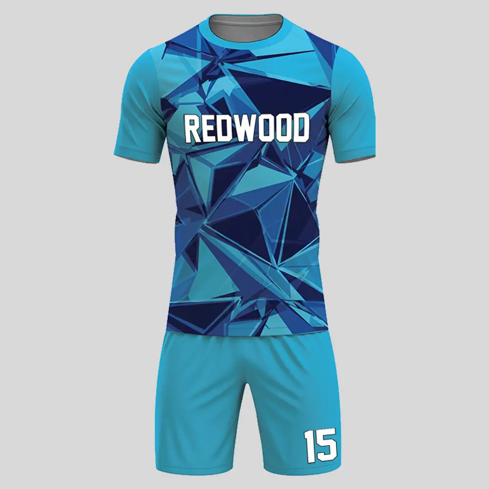 - Geometric Sublimation Design: Jersey features dynamic blue patterns with “REDWOOD” printed across the chest—fully customizable with your team name or logo.