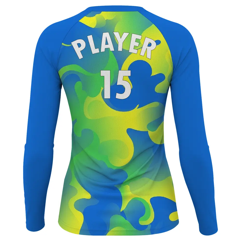 The crewneck women’s long sleeves volleyball jersey is a bold, performance-ready piece designed for female athletes who want full coverage, vibrant style, and complete personalization. Featuring a dynamic camouflage-inspired pattern and breathable fabric, this jersey delivers comfort, durability, and team identity.